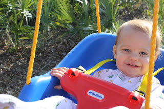 Carson and I decided that since it was such a beautiful day that we would go for a walk! In our neighborhood there are two swings in this beautiful wooded area that some of our neighbors put up and said anyone could come and swing anytime 🙂 Carson just loved it!! he was giving me big smiles the whole time, it was awesome!