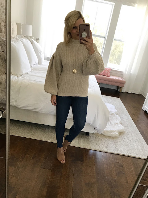 Blouson Sleeve Sweater // Jeans // Necklace // Earrings // Open Toe Booties