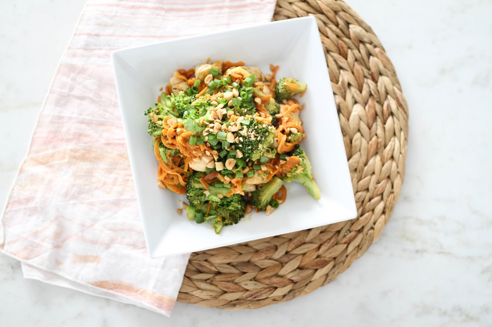 This recipe is super healthy, but it’s packed with flavor. The peanut sauce is so yummy, and I highly recommend making a little extra to save for later. It refrigerates well and is awesome to use as a healthy dipping sauce or dressing.