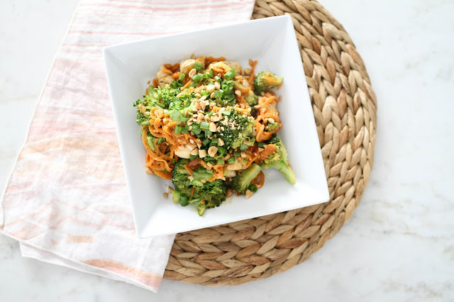 - Turn heat down to a little above medium then add remaining 2 Tablespoons oil. Add sweet potato noodles and broccoli, season with salt and pepper, then saute for 5 minutes, stirring occasionally. Add water then saute until noodles are al dente, another 3-5 minutes (if you like a softer sweet potato continue cooking but know that the noodles will break up a bit.) Add chicken back into the skillet along with the Thai peanut sauce then toss until the noodles are well coated and everything is heated through. Scoop into bowls then serve with toppings.