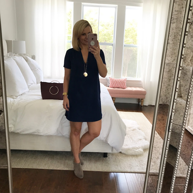 Split Neck Crepe Dress (only $46) // Booties (on sale) // Cuff //