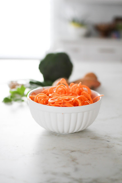 - 2 medium sweet potatoes, peeled then spiralized using thinnest blade, noodles slightly trimmed