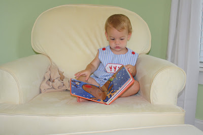Carson loves to be a big boy! Now in the mornings he sits at the big table with us and eats his breakfast. It is so funny to watch him 🙂 So today I asked if he wanted mommy to read him a book, and I got the hint real fast! no mommy i want to sit in the big chair all by myself and read the book all by my self! So that is what I let him do 🙂