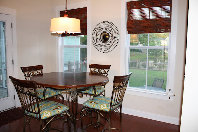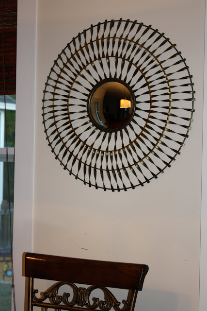 Well this project took a little longer than expected. I really had a hard time finding art or a mirror that I loved for this space. That is when I decided to shop the house! I am usually not very lucky when it comes to this, but this time I think I was 😉 Not that huge of a change, just some modern new fabric on the chairs and a fun little mirror! So what do you guys think??