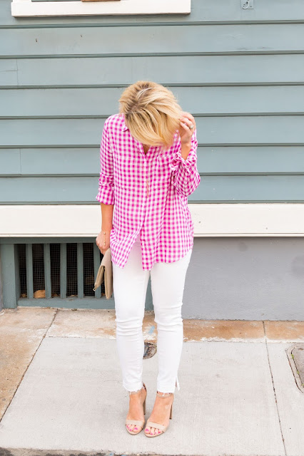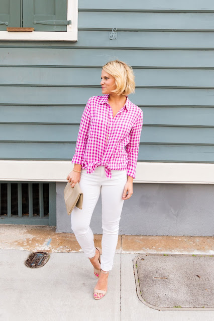 This shirt is lightweight and so soft, and if pink checks aren’t your thing, it also comes in six other colors and patterns! I just ordered the light blue stripes and I can’t wait for it to arrive! I mean, you really can’t beat a good soft button down for under $50. And if you’re on the hunt for a good pair of stretch white jeans that aren’t see through, make sure you check these out. Also, a few of you asked about the sizing, and so you know, it runs tts. For reference, I’m wearing it in the xs.