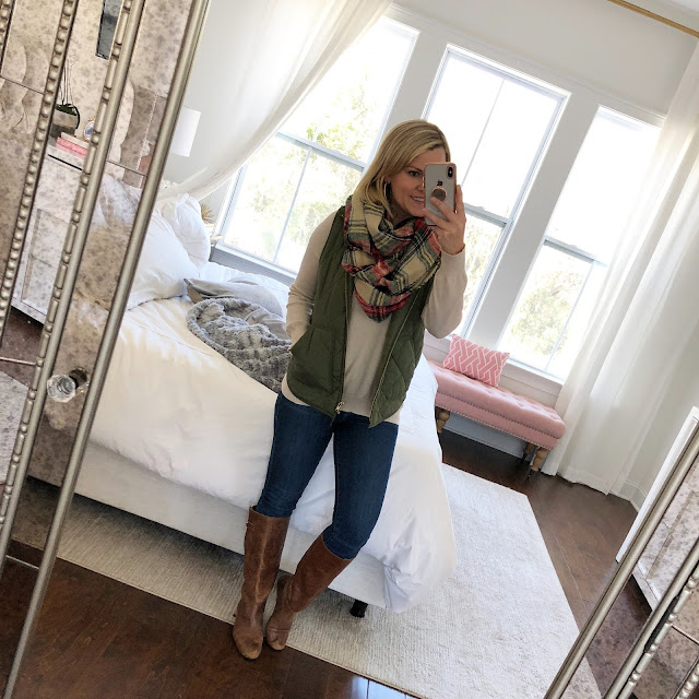 Puffer Vest // Pullover Sweater // Plaid Infinity Scarf (only $12)