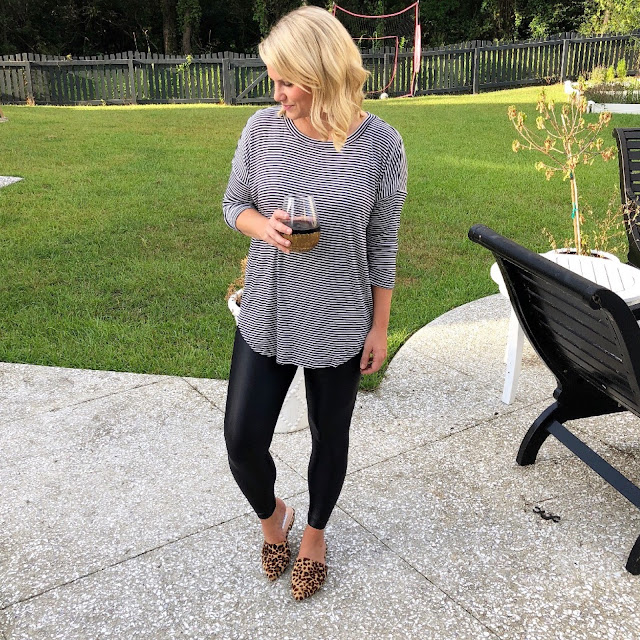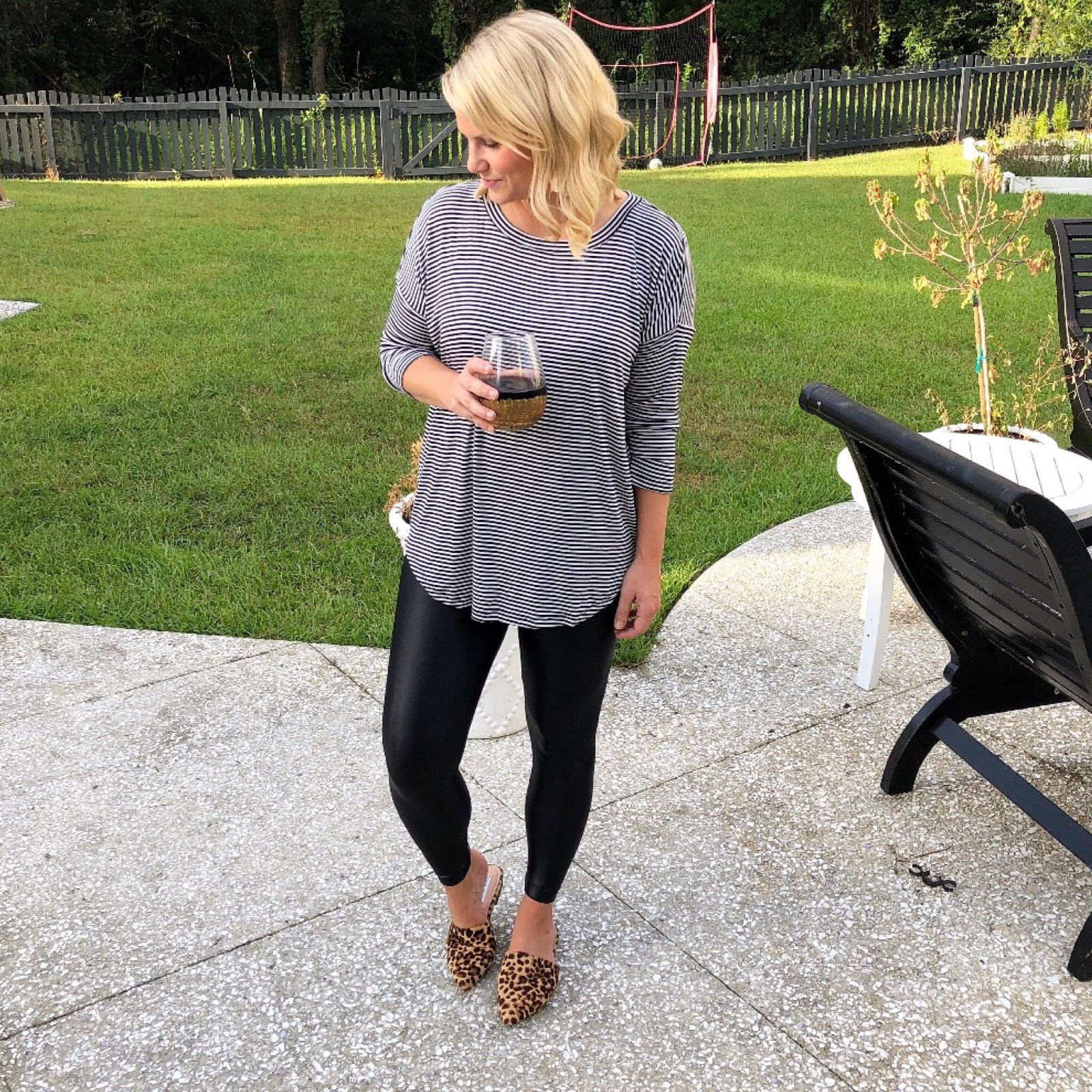Striped Shirttail Tee (on sale) // Lustrous High Rise Leggings // Leopard Mules