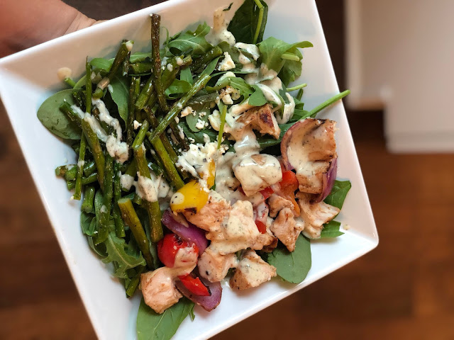 But anyway, my whole point in all of that was to share the salad I ate last night. Todd grilled chicken and vegetable kabobs, while I roasted asparagus. I cut everything up into small pieces, and then added a very small amount of feta and about two tablespoons of Tessemae’s creamy ranch dressing…it was so good!!!