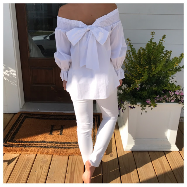 Off the Shoulder Bow Top // Jeans also similar and cheaper here