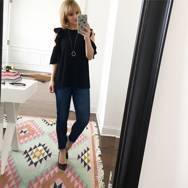 Off the Shoulder Top // Black Jeans // Headband // Pumps
