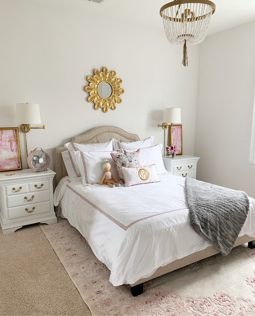 We finished Taylor’s new room and I am so in love with how everything turned out!  I have received so many questions about her upholstered tufted bed and specifically the quality since we ordered it online from Walmart.  Seriously you guys, it may be the nicest bed we have in the house.  Todd said it was one of the most detailed and sturdiest beds he’s ever put together.  I am going to show you guys a little more detail today on stories, but I was seriously blown away with how great the look and quality is.