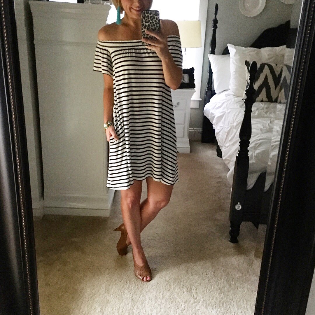 // My $42.00 off the shoulder stripe dress was just restocked, but it looks like sizes are going fast!