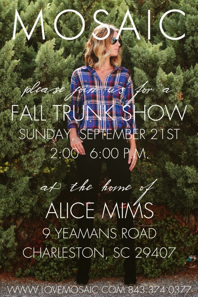 * All you Charleston ladies, you do not want to miss the Mosaic trunk show that is coming here this Sunday! Leah really has some of the most amazing pieces I have ever seen. Not to mention, she’s a total sweetheart. Trust me when I say it’s going to be fabulous!
