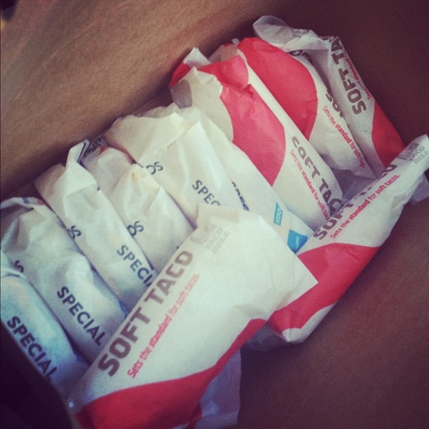 Taco Bell this should be illegal….yes that is a suitcase full of tacos! And why yes I ate half the box.