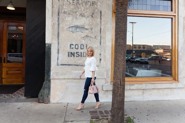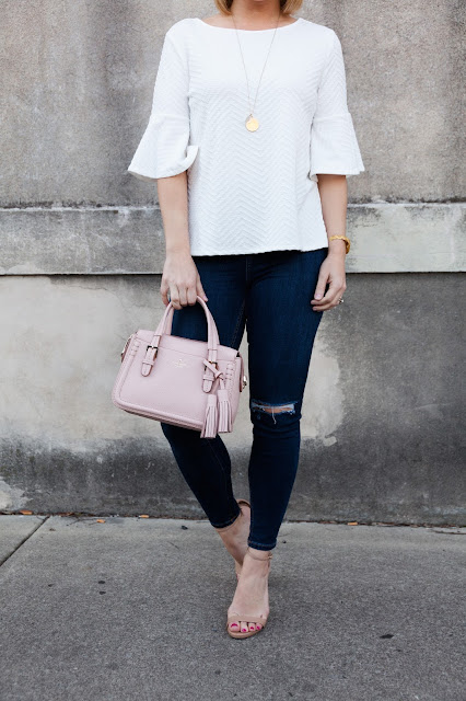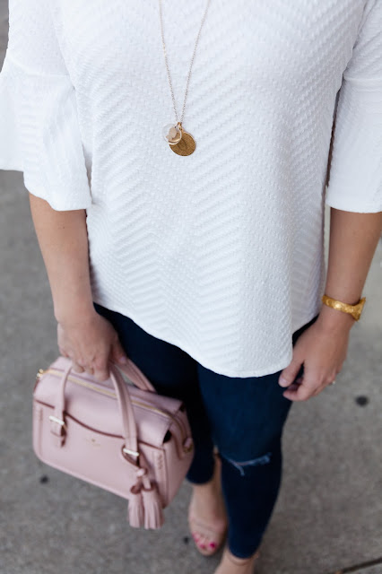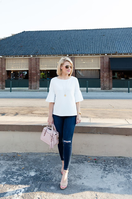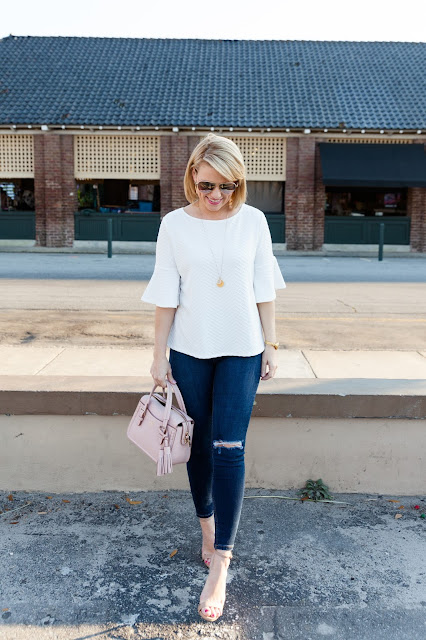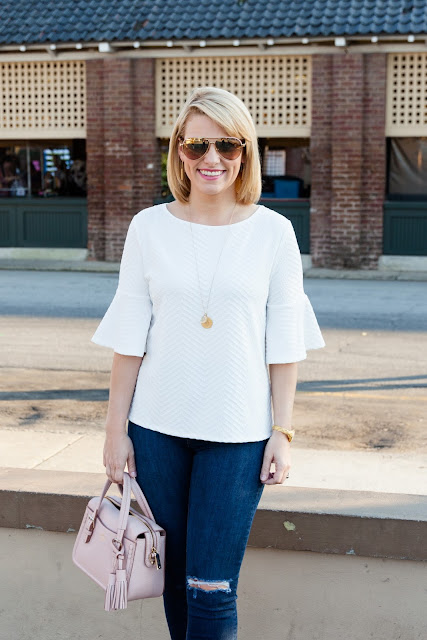 When in doubt, I always turn to a white blouse and a pair of ripped jeans. So, as soon as I spotted this Herringbone top with the fun bell sleeves, I knew I needed to grab it! For sizing reference, it runs tts and I’m wearing the xs.