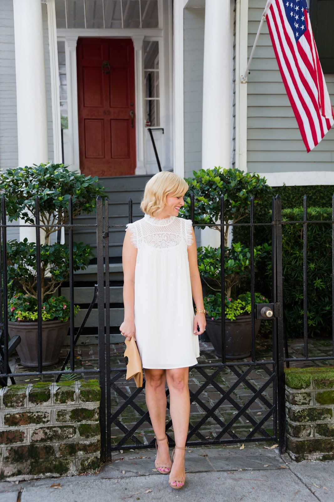 Happy Tuesday, y’all!! I wore this dress last weekend to an outdoor event, and then again for date night last week. It’s super lightweight, which is so nice with the hot days we’ve been having, and even though it’s white, it’s lined so you can’t see through it at all. I’ll call it a white dress win 🙂