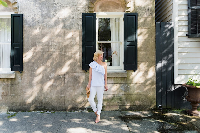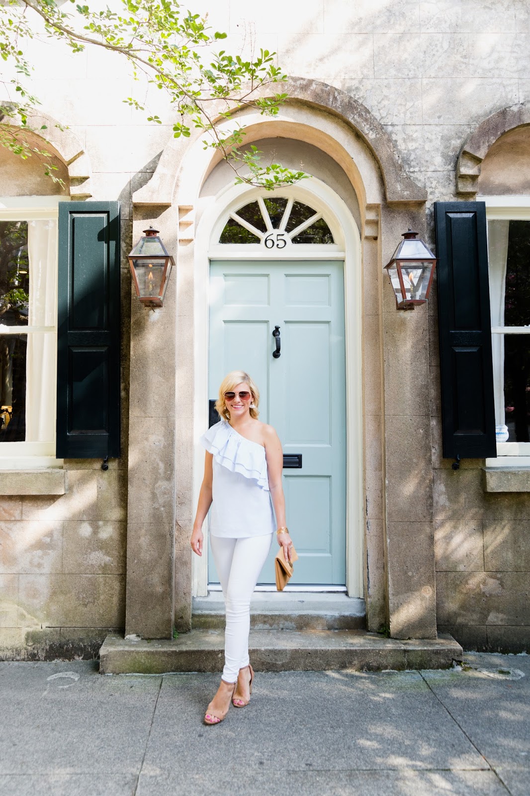 I’m excited to share one of my new favorite looks with you all today. And dare I say that I may just love the one shoulder look as much as off the shoulder? This little beauty comes in five different colors, but I was immediately drawn to the light blue stripes. Blue stripes + white jeans are one of my favorite spring /summer combos.