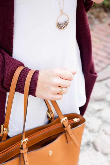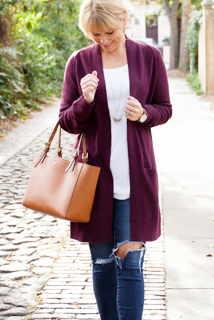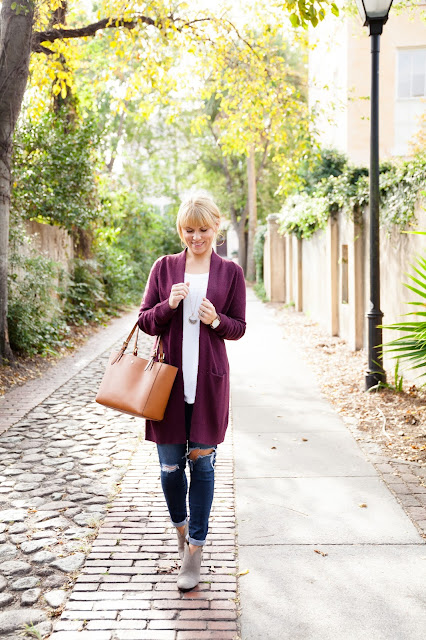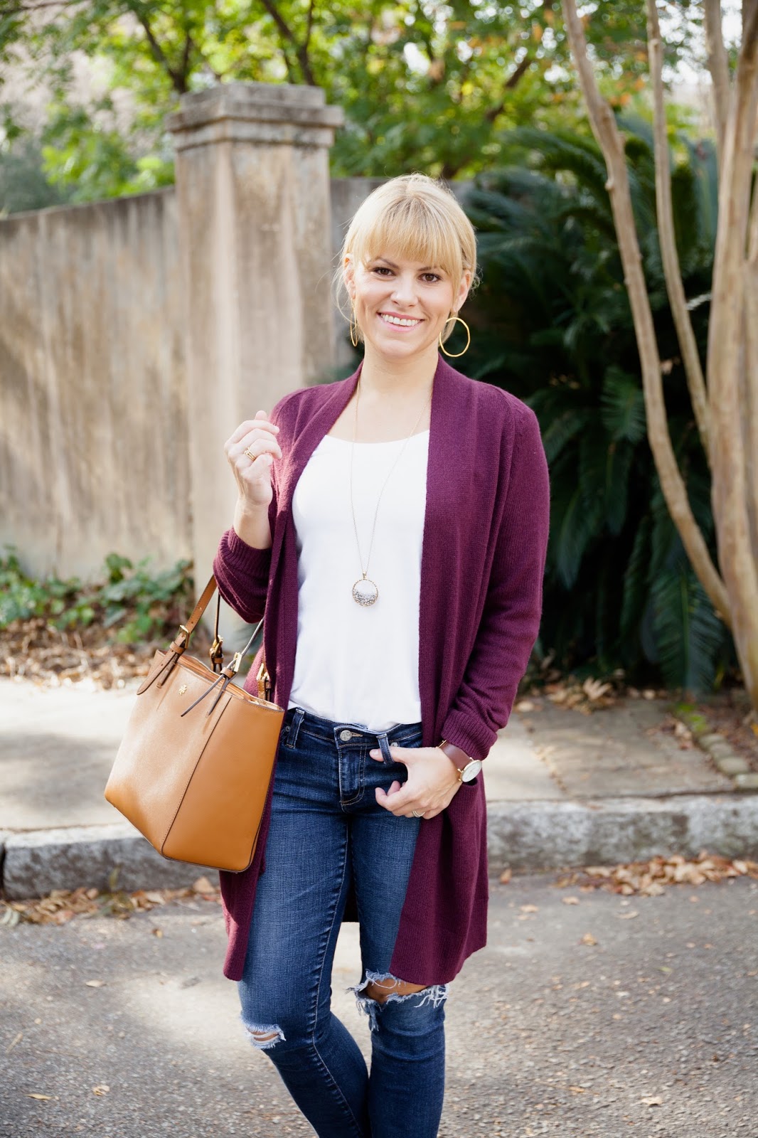 Open Front Cardigan also here // White Scoop Neck Tee (my favorite – I now have in 4 colors) // Jeans (I’m wearing the darker wash) // Booties // Tote // Necklace // Earrings // Watch