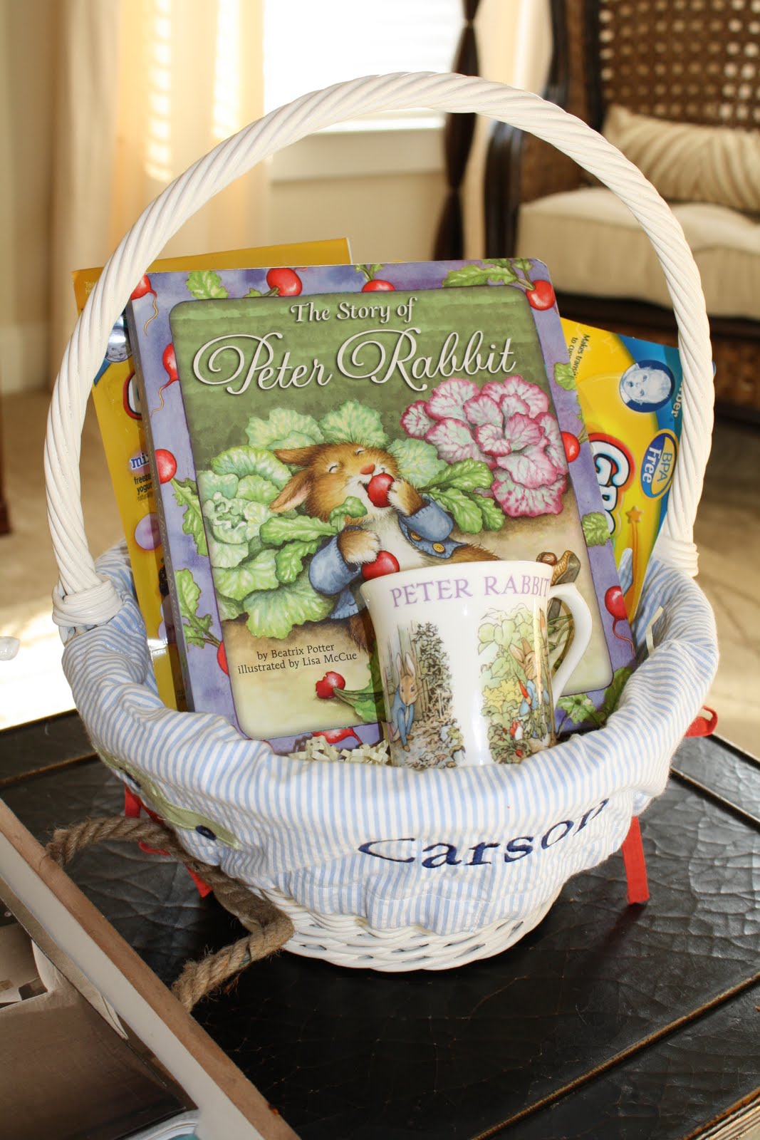 Carson basket is ready to go….. it was pretty easy this year considering he cant talk ha! We just did some sippy cups, yogurt bites, Peter Rabbit book, and cup! I cant wait to see his face Easter morning, even though he want have a clue what is going on! So what did you put in your babies basket?