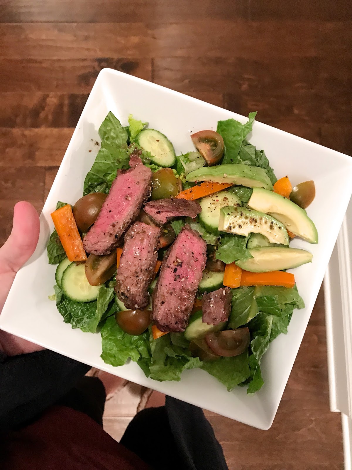 For this recipe, we just marinated an organic grass fed strip steak with avocado oil, salt, and pepper. Then, I added in mini heirloom tomatoes (from Trader Joe’s), orange bell pepper, avocado, and this salad dressing.